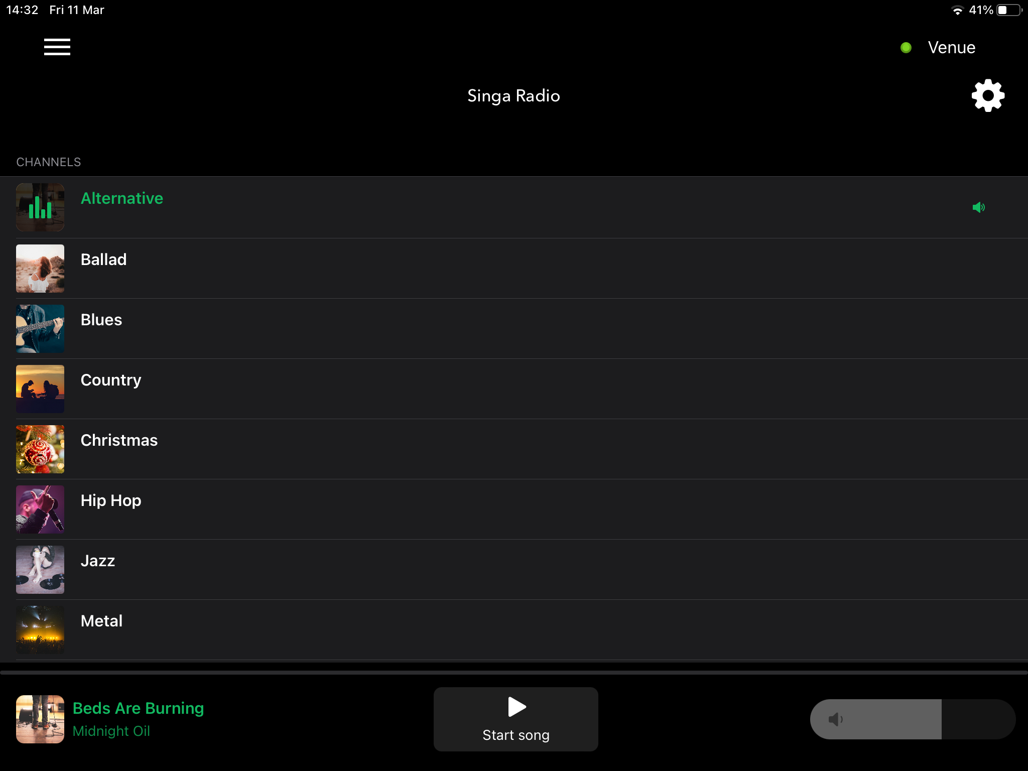 Öffnen Sie den Bereich Musik. Hier können Sie das Genre der Hintergrundmusik auswählen, die zwischen den Karaoke-Songs abgespielt werden soll. Singa Radio ist ein kostenloser Hintergrundmusikdienst, der in all unseren Paketen enthalten ist.