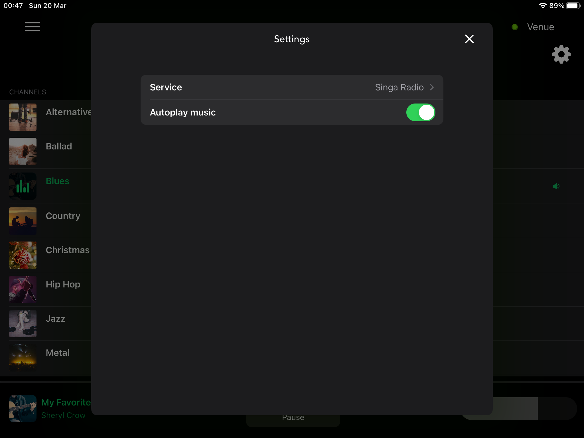 Singa Radio ist als Standard eingestellt. Tippen Sie auf „Dienst“, um Ihren gekauften Hintergrundmusikdienst aus der Liste auszuwählen.