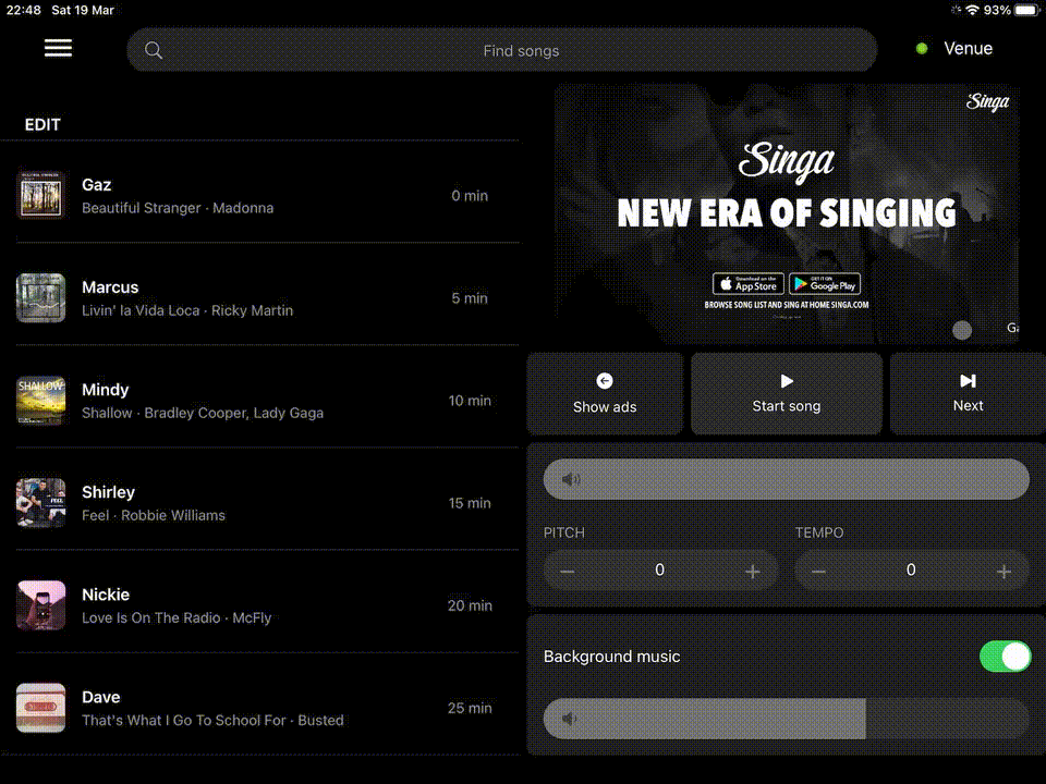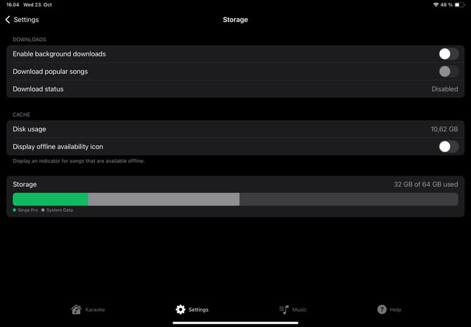 Beachten Sie, dass die Songauswahl von Singa ständig wächst. Daher empfehlen wir ein iPad mit mindestens 512 GB Speicher, um eine umfangreichere Anzahl von Liedern im internen Speicher des iPads herunterladen zu können.